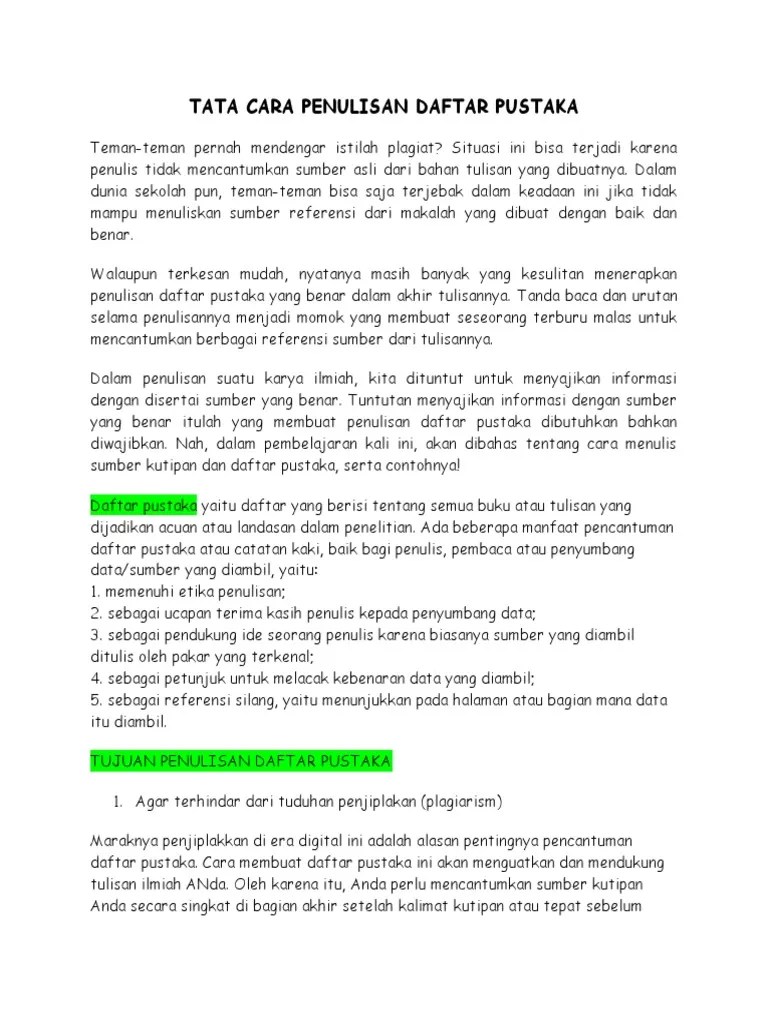 Kata, dalam satu alinea tanpa acuan (referensi) tanpa singkatan/akronim, . 5.2 jika nama penulis terdiri dari dua kata atau lebih. Nah, berikut ini contoh cara menulis daftar pustaka dari sumber buku, . 5.5 contoh penulisan daftar pustaka dari skripsi, tesis, disertasi. Pengertian daftar pustaka menurut para ahli : Dalam dunia sekolah pun, bisa saja terjebak dalam keadaan ini jika tidak mampu menuliskan sumber referensi dari makalah yang dibuat dengan baik dan benar. Setelah mengetahui pengertian daftar pustaka, kita akan membahas tujuan dan . 2.1 penulisan nama yang tersusun dari dua kata atau lebih. Apabila nama pengarang lebih dari satu kata, ditulis sesuai dengan apa yang. Rahasia menulis makalah disertai contoh daftar pustaka makalah. Nama penulis (.) tahun terbit (.) judul . Dengan kata lain, nama penulis ditulis apa adannya nama panjang si . Jadi, dapat dipastikan setiap dosen akan meminta mahasiswa untuk menyertakan daftar pustaka di setiap akhir makalah, skripsi, laporan atau karya tulis ilmiah .